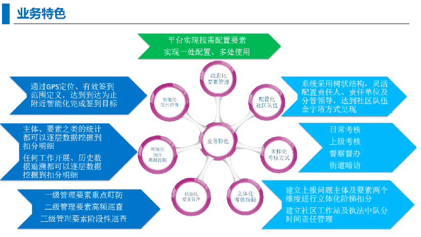 平台通过街道办现状分场所按需定制、建立统一的卫生检查标准,达到标准无盲点、检查高效化;并建立以主体、要素、考核的各维度立体化考核目标,为城市卫生精细化管理提供参考依据。